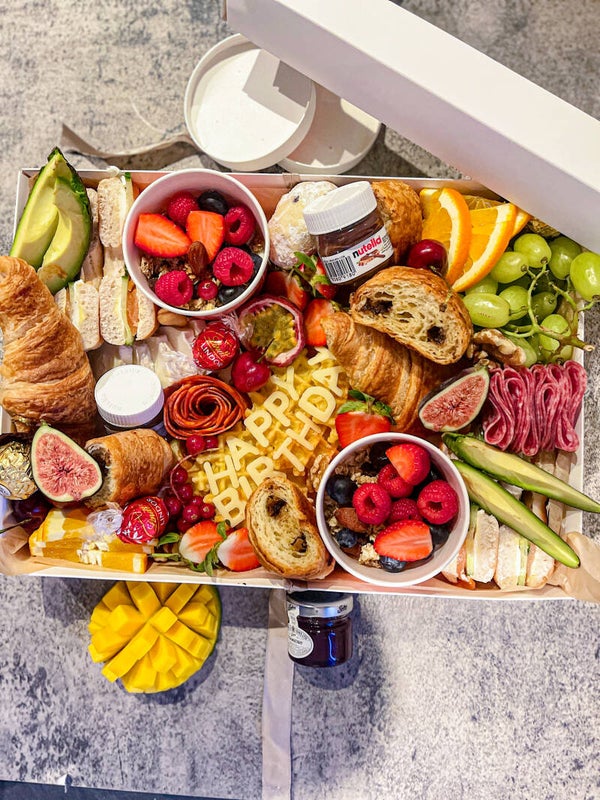- Contents: [Croissants, assorted fruits, cheeses, charcuterie, bagels, yoghurt granola pots, waffles]
